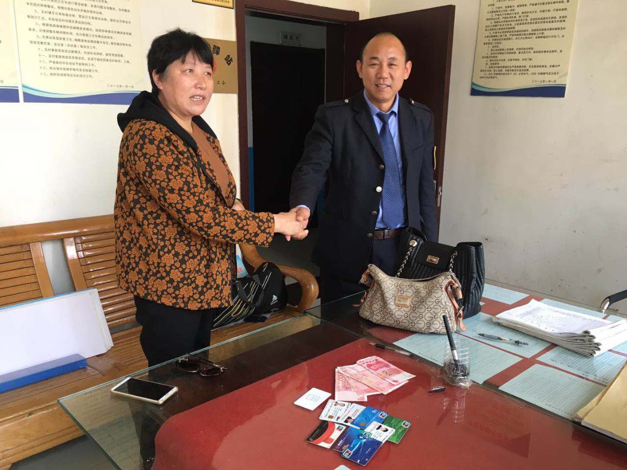 据了解,王女士从项里小区站乘坐苏N11520公交车到达红星美凯龙时,因疏忽大意将随身携带的手提包落在车内,包里有现金1500元、身份证、银行卡数张。察觉到包丢了的王女士万分着急,通过拨打义乌商贸城站务室电话后得知落在车里的包已被驾驶员董师傅捡到并交到站务室。