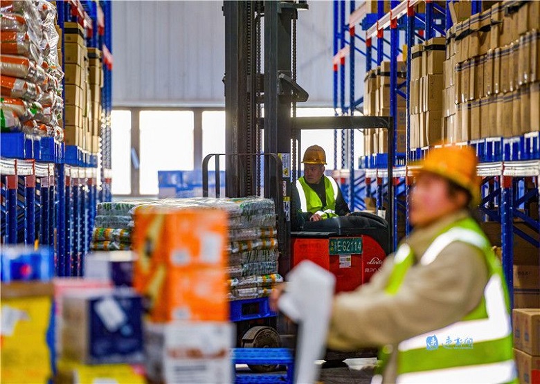 近日,宿迁经开区江苏通湖物流园内,工作人员正在有序作业,运输车辆来回穿梭,一派繁忙景象。