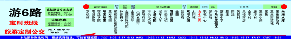 游6路始发点为京杭路公交调度站,终点站在宿城区王集镇朱海水库度假区,全程约32公里,共设置了35个站点,单程票价为2元,可享受城市公交刷卡等优惠政策。运行时间为早上6:40至晚上18:00,线路采取定点发班,班次间隔约为50分钟,后续将视客流情况调整运营班次及发车间隔。