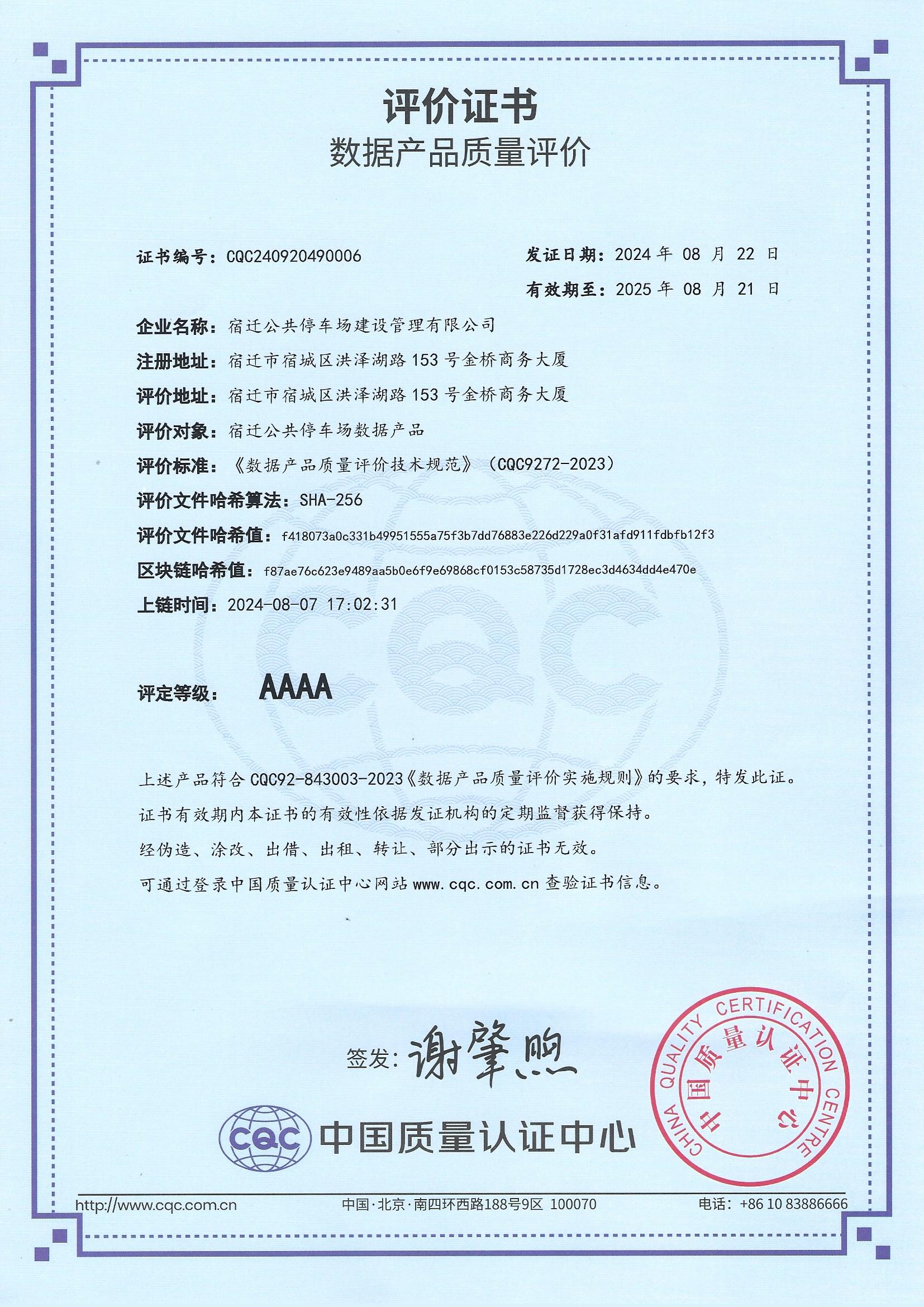 所属企业宿迁市交通科技发展有限公司(原宿迁公共停车场建设管理有限公司,以下简称“交通科技”)完成全市首个数据资产入表工作,数据资产入账价值达400万元,评估价值逾2300万元。经中国质量认证中心认定,该数据产品质量等级为4A级,为全市首张4A级证书,也是全省迄今为止第二张4A级证书,标志着宿迁数据知识产权登记、保护工作取得了新突破。