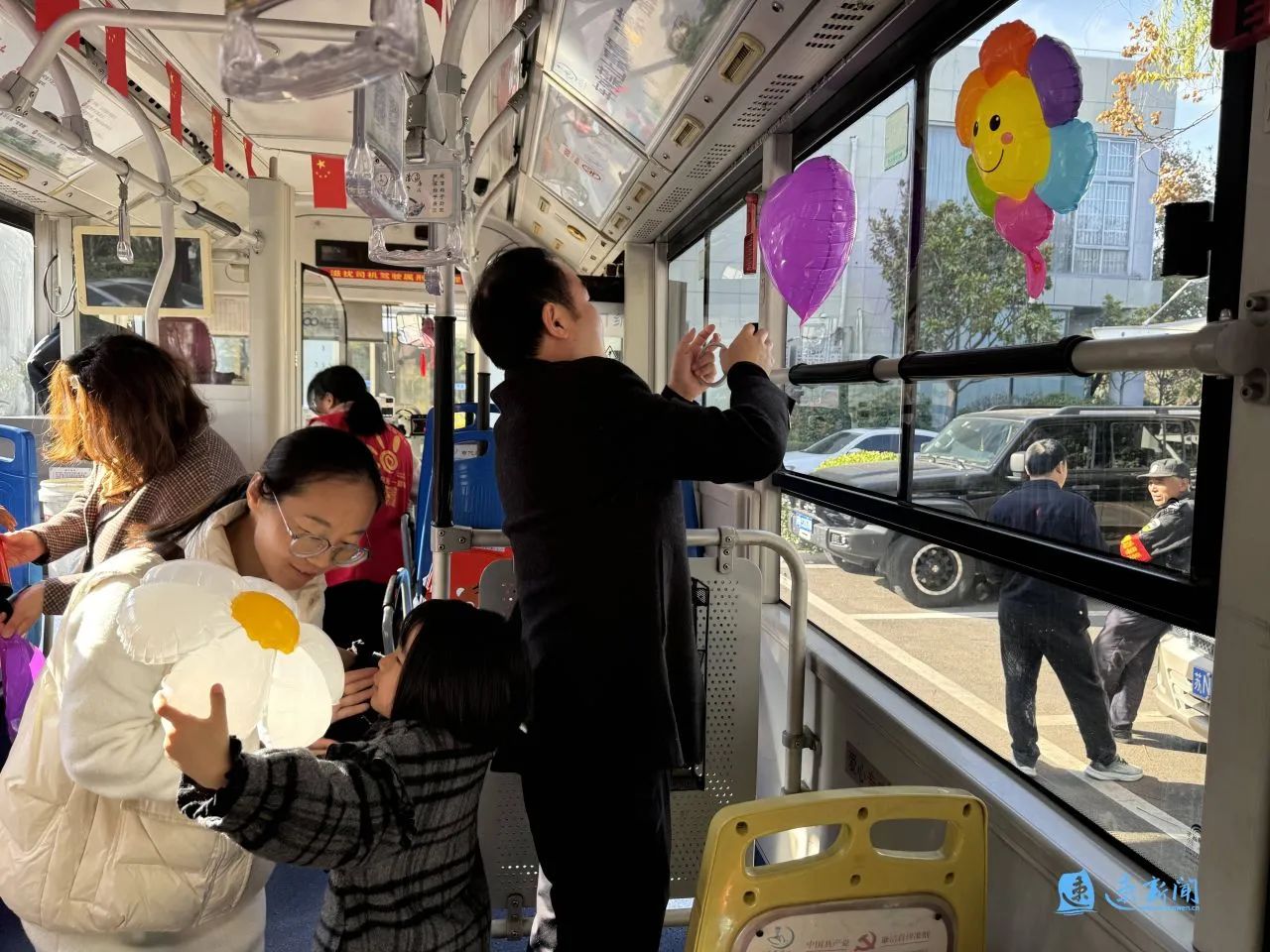 下午2点,孩子们在家长的带领下,在群众大厦集合签到后,登上了精心设计的儿童友好公交巴士。车内装饰环节中,孩子与家长合作,用气球和彩带把车厢装点得温馨满满,处处彰显“可爱宿迁 让爱童行”的内涵。随后,孩子们体验了公交车的各项设施,并认真聆听了儿童代表讲解的安全出行交通法规与绿色出行环保知识。