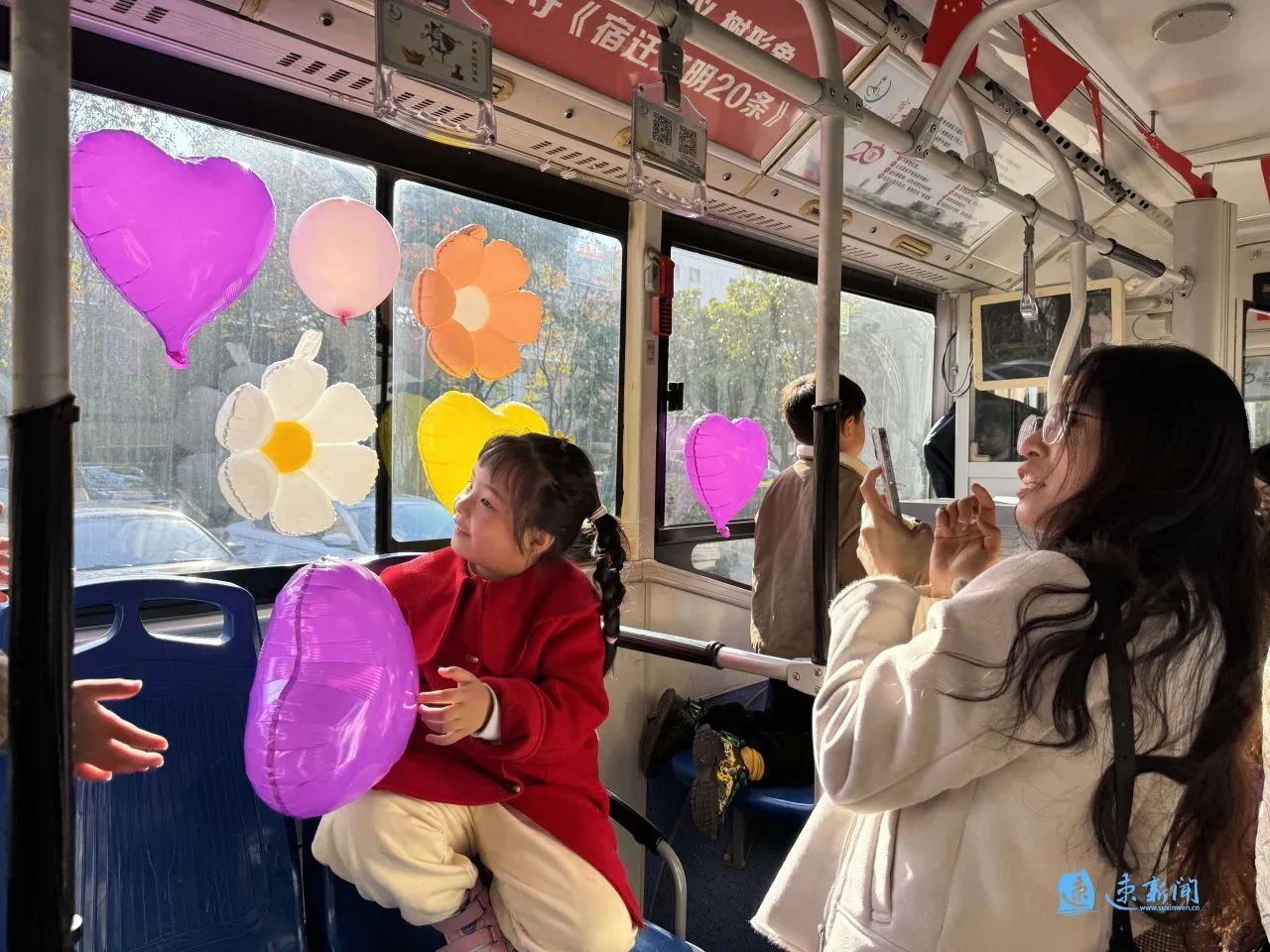 车窗被缤纷的气球“占领”,车身贴着“可爱宿迁 让爱童行”的标语……11月23日下午,宿迁市人民大道群众大厦的院子里停放了一辆儿童友好公交巴士,等待着孩子们用爱和童趣装点它。
