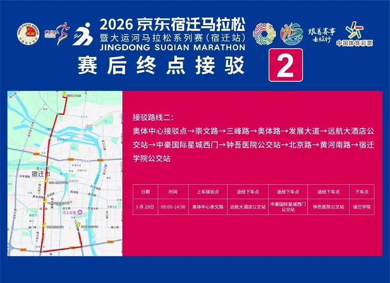 3月26日-30日,参赛选手可凭号码布或中签短信,免费乘坐宿迁市区内(宿城区、宿豫区、洋河新区、湖滨新区)公交车。