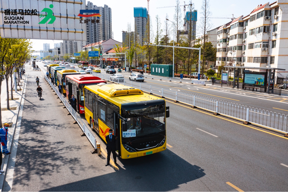 预先制定方案,灵活调整公交出行线路,按赛事期间部分路段分时段交通管制要求,以临时绕行、缩线、分段、停运等方式对55条公交涉及线路进行调整,并及时通过市级主流媒体等平台予以公告,确保乘客出行不受影响;临时开通迎宾大道高架(洪泽湖路至宿支路段),作为南北主要通行道路,最大限度保障群众出行需求。