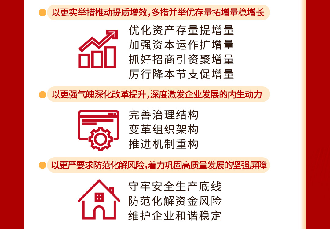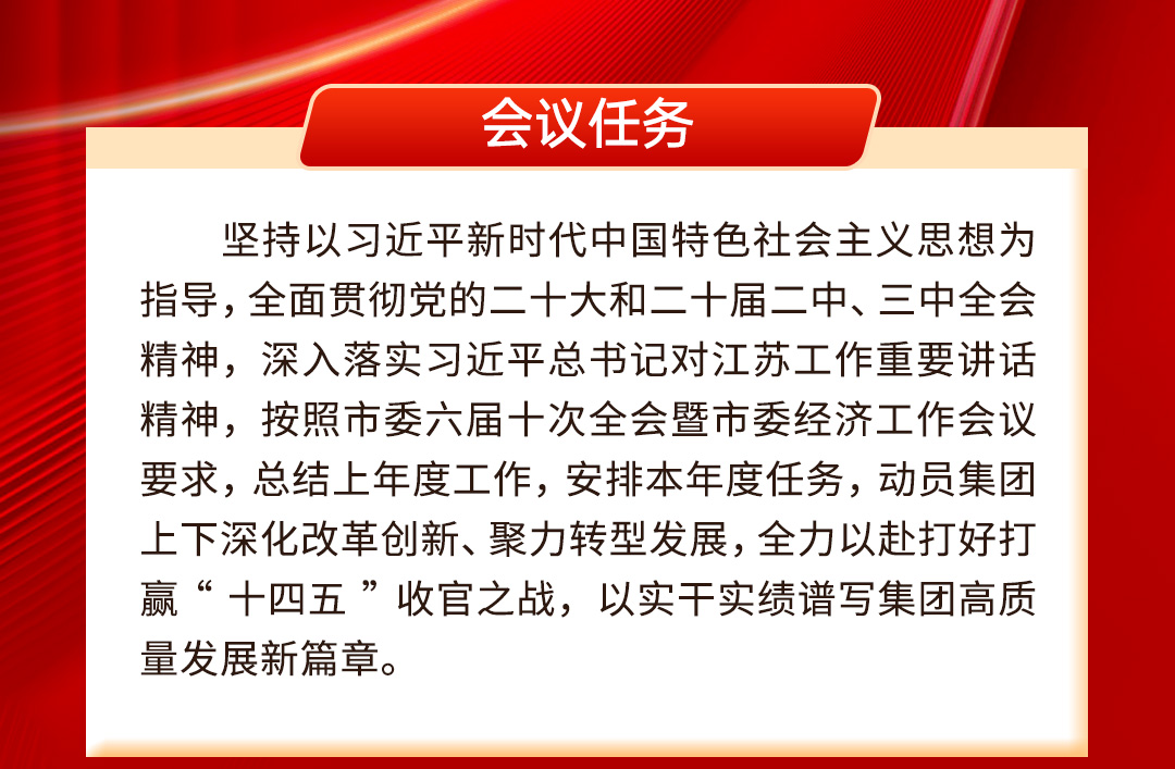 会议强调,2025年是“十四五”规划收官之年和“十五五”规划谋划之年,也是集团转型攻坚、加快发展的关键阶段,集团上下要聚焦增强核心功能、提高核心竞争力,聚力“高标准建设、高能级创新、高品质服务、高效能治理、高水平安全、高质量发展”,以更大力度推进重点项目、加快交通基础设施投资建设,以更快速度推进产业升级、坚定不移做大做强主导产业,以更高站位实施创新驱动、因企制宜加快发展新质生产力,以更实举措推动提质增效、多措并举优存量拓增量稳增长,以更强气魄深化改革提升、深度激发企业发展的内生动力,以更严要求防范化解风险、着力巩固高质量发展的坚强屏障,全力推动发展速度合理增长、产业结构不断优化、质量效益持续提升,奋力开创高质量发展新局面,为全面推进中国式现代化宿迁新实践作出新的更大贡献。