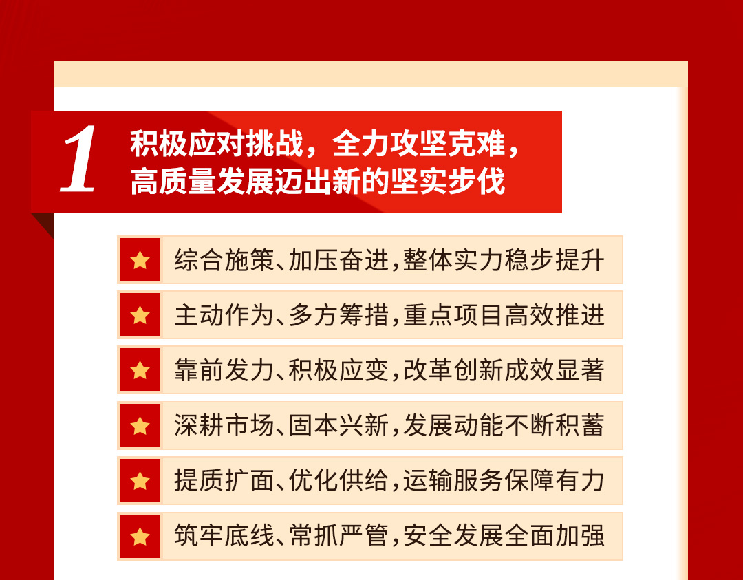 2024年,集团坚持以习近平新时代中国特色社会主义思想为指导,全面贯彻落实市委、市政府部署要求,综合施策、加压奋进,整体实力稳步提升;主动作为、多方筹措,重点项目高效推进;靠前发力、积极应变,改革创新成效显著;深耕市场、固本兴新,发展动能不断积蓄;提质扩面、优化供给,运输服务保障有力;筑牢底线、常抓严管,安全发展全面加强,扎实推动各项工作取得新进展新成效。