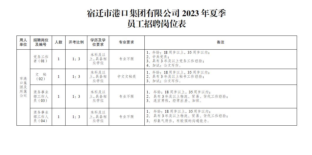 本次面向社会公开招聘工作人员共4人,具体岗位详见《宿迁市港口集团有限公司2023年夏季员工招聘岗位表》(见附件,以下简称《岗位表》)。