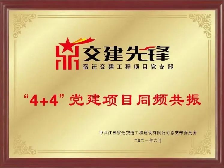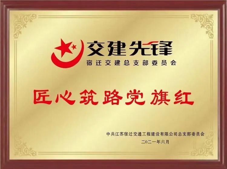宿迁交建党总支于2020年7月创建“交建先锋·匠心筑路党旗红”党建品牌,品牌标识由两颗大小不一的五角星、向上倾斜曲线和文字构成,整体标识设计是对中国共产党党旗的抽象和延展,体现了党领导一切的原则。其中,“匠心”取工匠精神蕴含的爱岗敬业、苛求自我、追求极致的价值内涵;“筑路”侧重展现宿迁交建做强做实支柱性主业的中心任务;“党旗红”侧重明确党组织和党员干部在推动企业高质量发展中的引领作用,树立发挥基层党组织战斗堡垒作用导向,以高水平党的建设凝聚干部职工创业干事合力。
