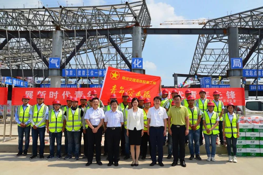 6月27日下午,团市委书记耿晓云及部分团干部代表来到宿迁高铁综合客运枢纽项目建设现场,走访慰问高铁一线青年职工,并为91porny 高铁配套工程青年突击队授旗。