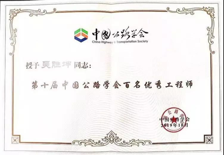 近日,第十届中国公路学会百名优秀工程师评选结果出炉,宿迁交建公司的吴胜坤荣获中国公路第十届百名优秀工程师荣誉称号。