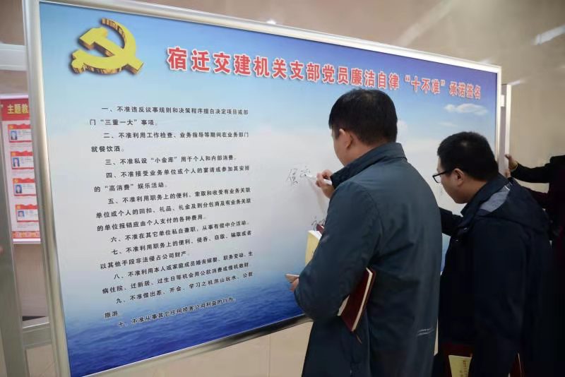 随后,全体与会人员签订《宿迁交建廉洁自律十不准》承诺书。签订仪式上,支部书记要求大家充分发挥表率作用,对照承诺书进行经常性自我检查,将自己置于组织和职工的监督之下,自我警示、自我约束。