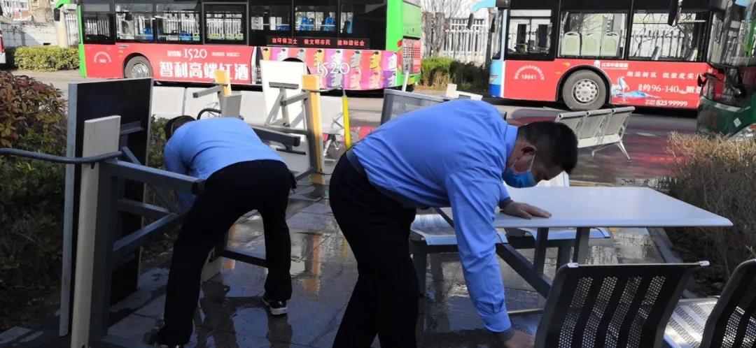 调度员和驾驶员对停车场进行全面清扫,集中清理场站内的卫生死角,对餐厅内座椅、空调、微波炉及办公区设施设备逐一清洗、消毒,对地面地板彻底冲洗并喷洒消毒液。