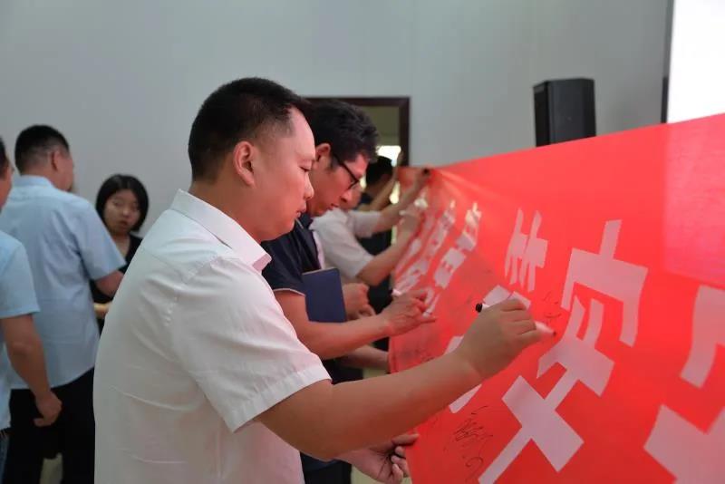 仪式上,全体人员共同观看了施工现场安全隐患排查宣教片——《排患解危》,并在“消除事故隐患 筑牢安全防线”主题横幅上签字。