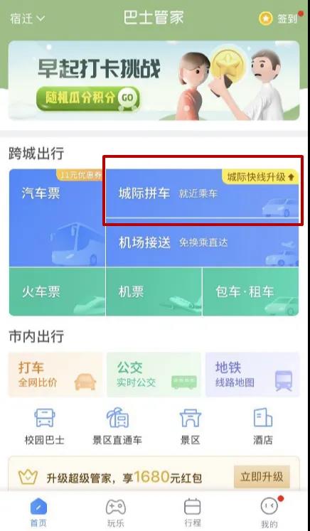 步骤一:打开“巴士管家”APP或“巴士管家”微信小程序,选择“城际拼车;