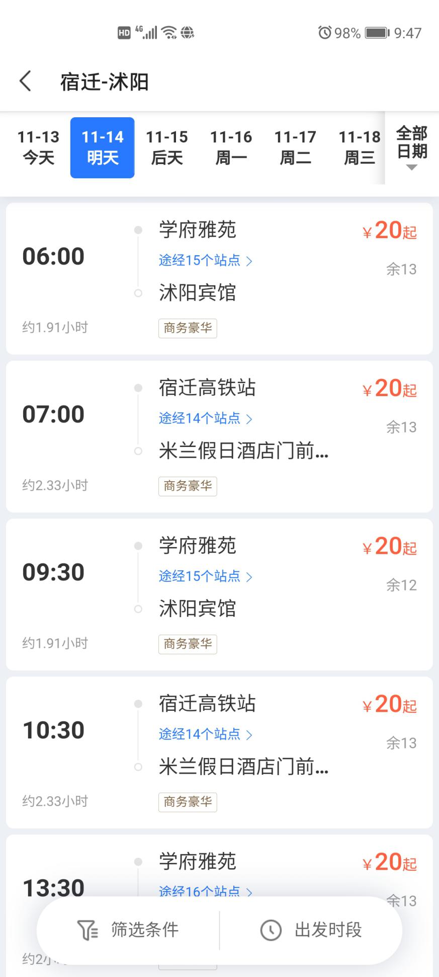 步骤二:选择出发到达城市,例如:“宿迁-沭阳”;