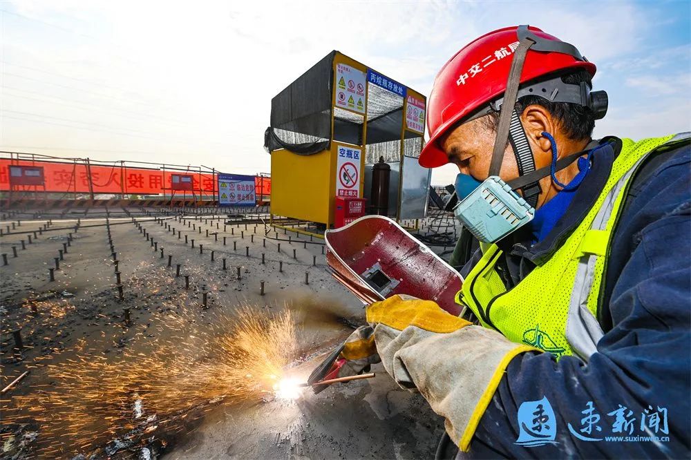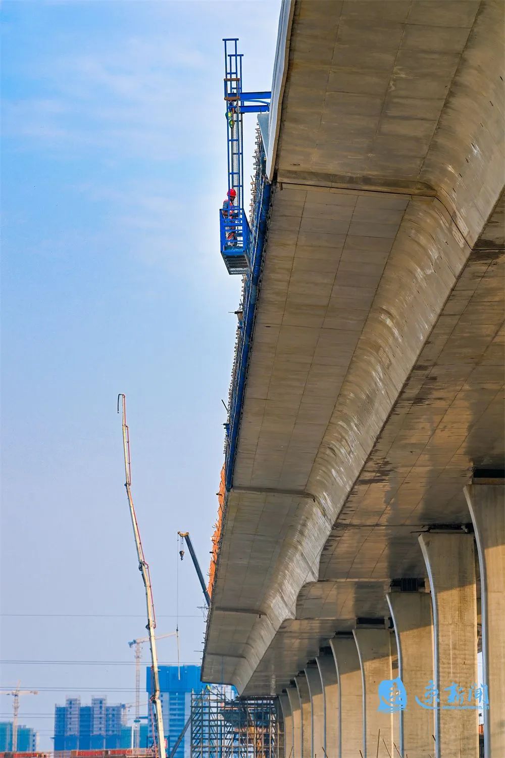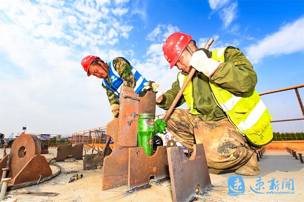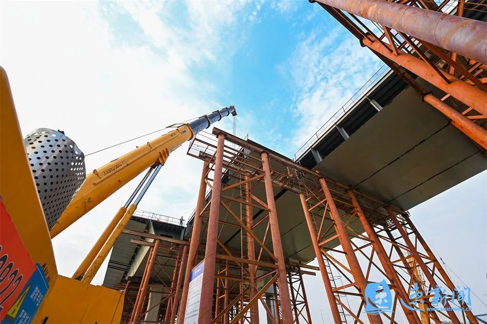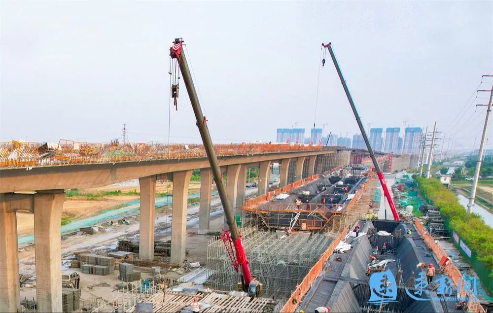 6月14日,在宿迁市酒都路快速化改造工程现场,建设者加紧施工作业,全力推进项目建设进度。