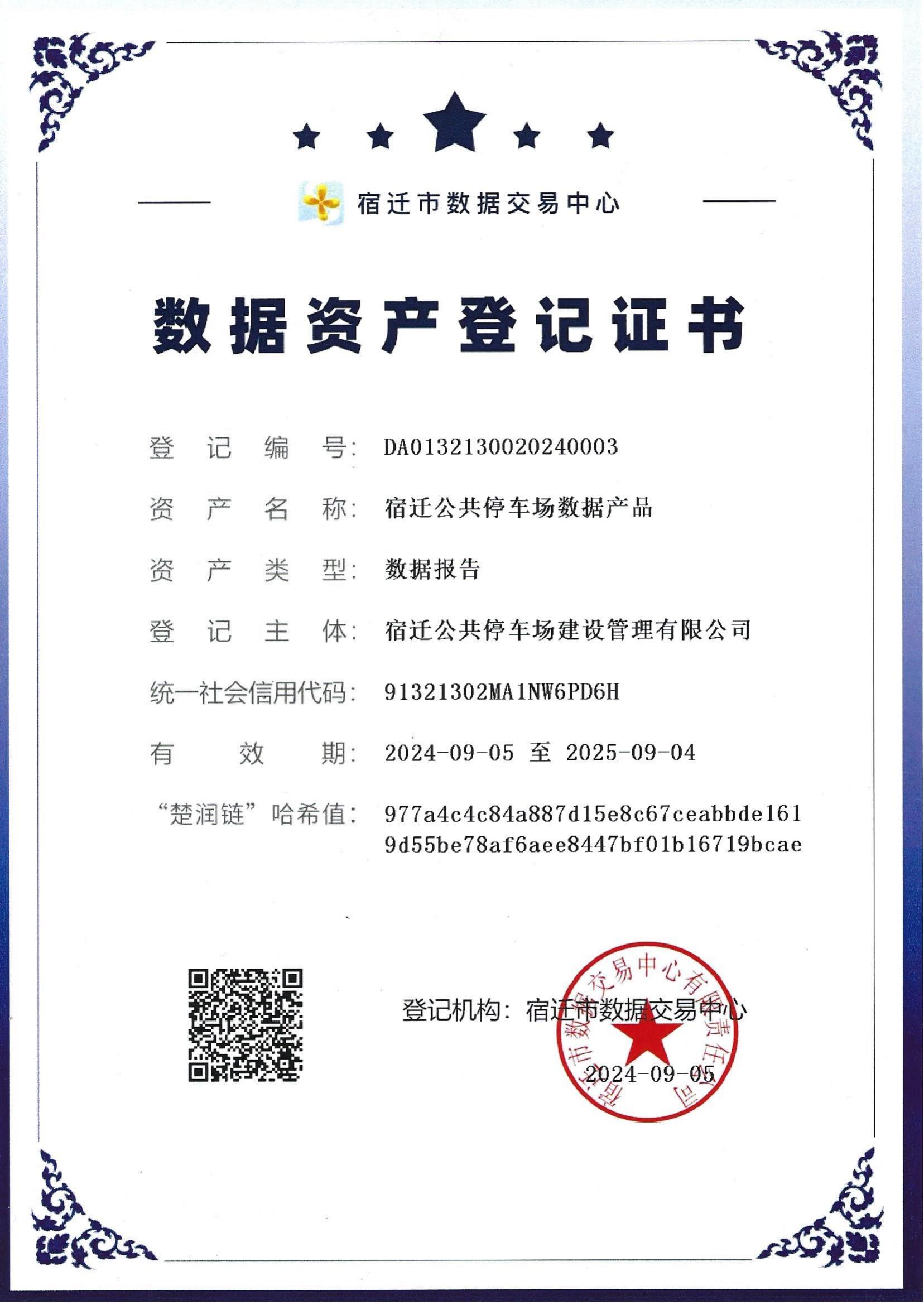 关于“挖掘数据资本 释放企业潜能”的工作要求,依托宿迁中心城市公共停车信息,积极开展停车数据资产普查、评估、会计入表、知识产权申报等工作,成功取得数据资产登记证书。据悉,该数据产品是通过对公共停车场的泊位供应数据、停车需求及特征数据、停车相关服务处理数据、停车场运营数据、新能源充电桩供给与服务数据等开展定期数据统计、分析和挖掘,定期生成数据分析报告,为提升智慧城市建设提供决策支持,为运营单位开展精细化管理提供数据支持,进一步提升公众出行体验。