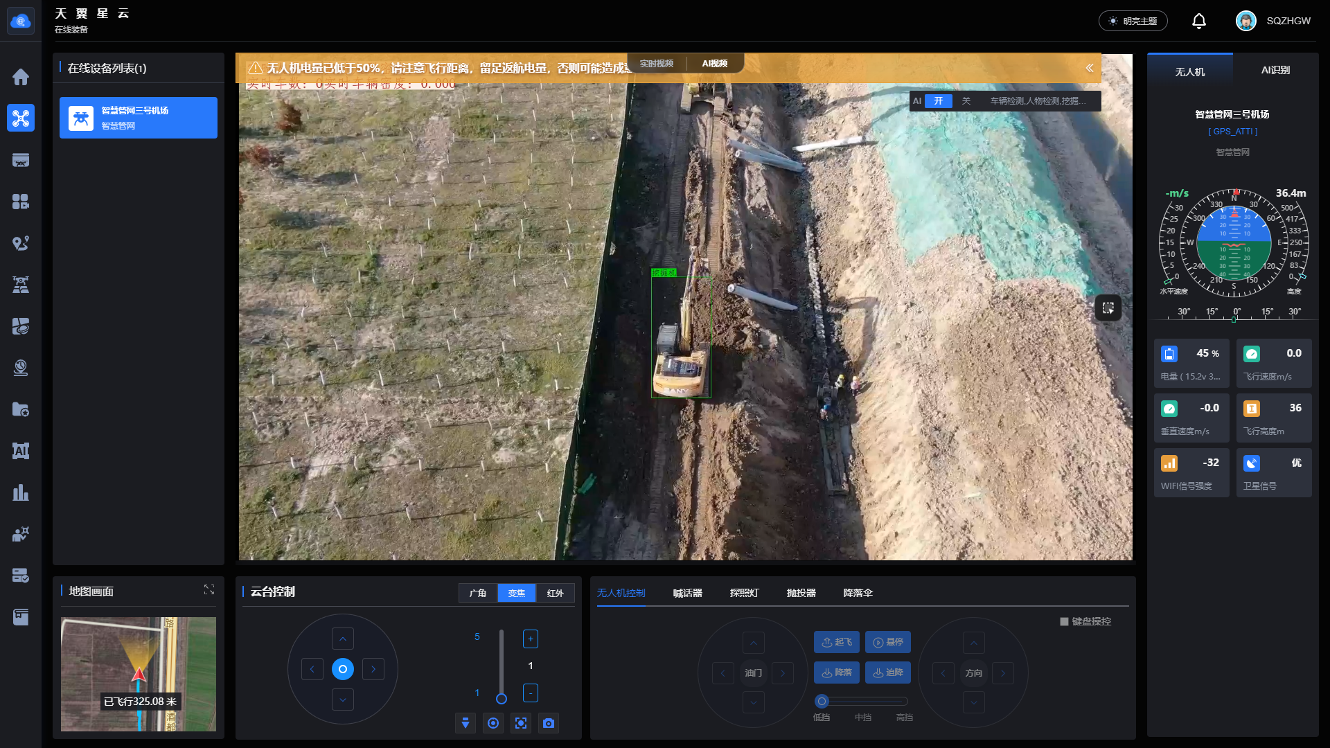 供热管网工程作为城市能源输送的“地下动脉”,其涉及人员安全监管、设备调度及地形勘测。传统人工巡检存在效率低、盲区多、安全隐患难追溯等问题。针对这一难题,宿迁市低空科技发展有限公司大力发展“平台+无人机+AI”技术,打造的“智慧巡检员”可自主起降并完成全区域覆盖式巡检,单次任务可替代3-5人团队6小时工作量。在监测模式上,实现了“定期巡查”向“日常监督”的升级,以极快速度对施工区域实现全覆盖巡查,高频次、无死角监测。在监管体系上,实现了从“人工巡检”到“智能巡检”的转型,有效规避了巡检人员直接暴露于危险环境的风险,确保人身安全。
