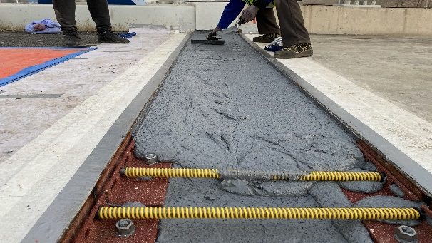 本工法创新性提出了“自由变形体系、传力体系、锚固体系”三位一体的桥梁变形自适应无缝伸缩装置结构。同时开发拌和运输一体化行星式拌和车,形成了超韧混凝土全数字化、机械化施工工艺,形成双层高摩擦多孔角钢、跨缝梳齿变位板等构件模块化装配工艺,使用自动化跨缝同轴整平机,形成了超韧弹性体层布法浇注-自动化整平施工工艺。