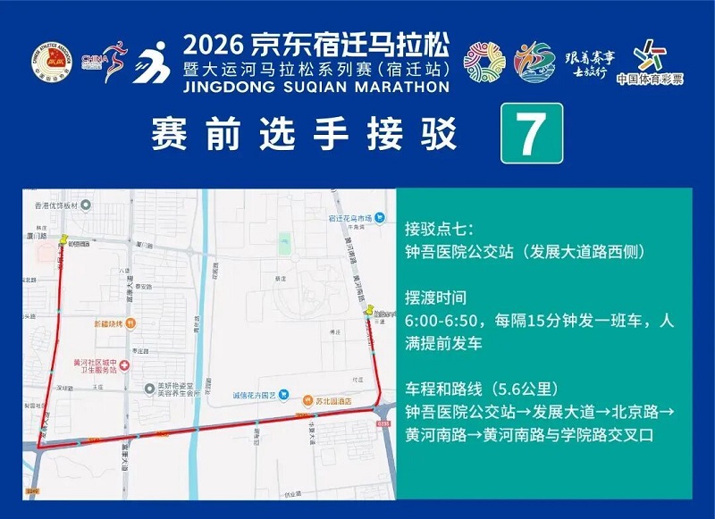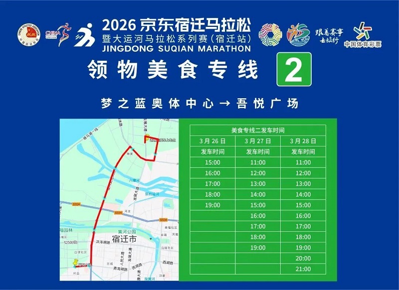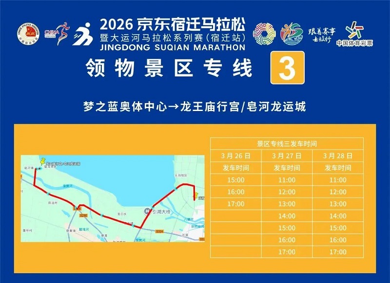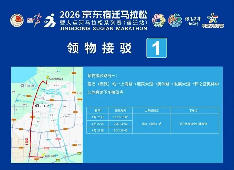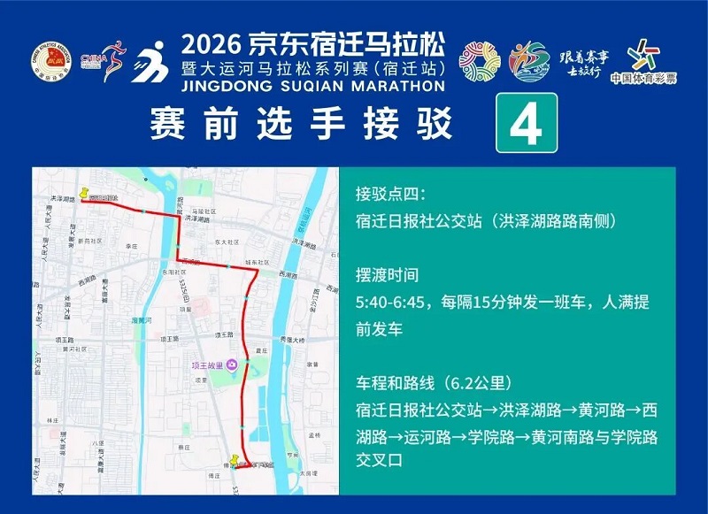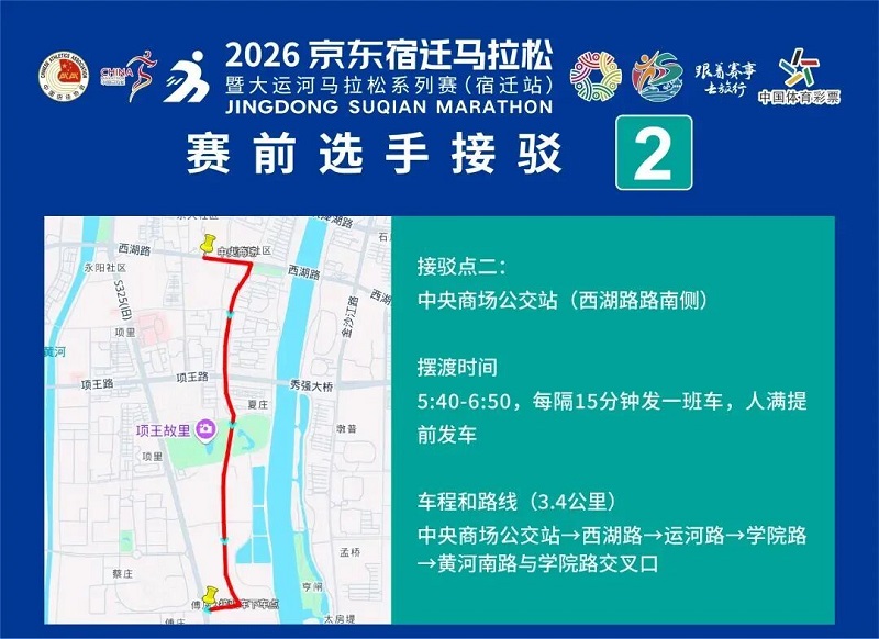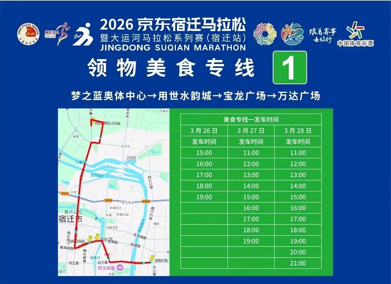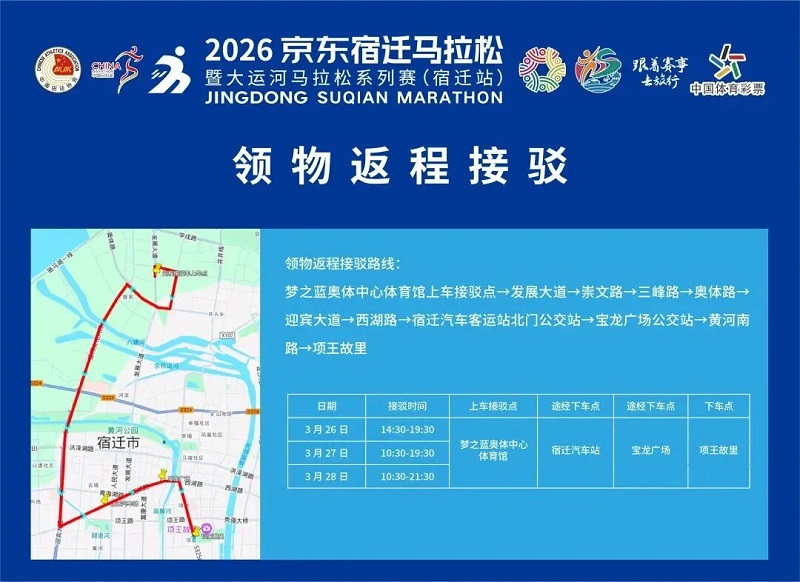 3月26日-30日,参赛选手可凭号码布或中签短信,免费乘坐宿迁市区内(宿城区、宿豫区、洋河新区、湖滨新区)公交车。