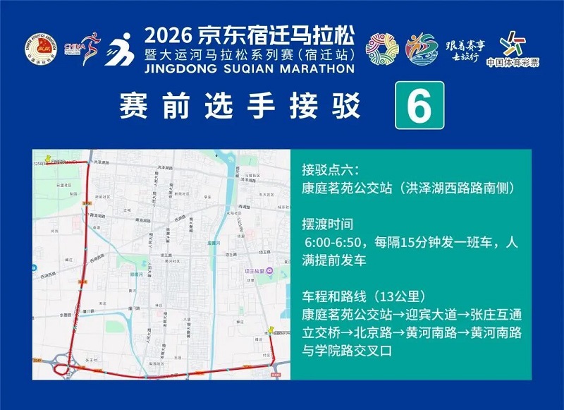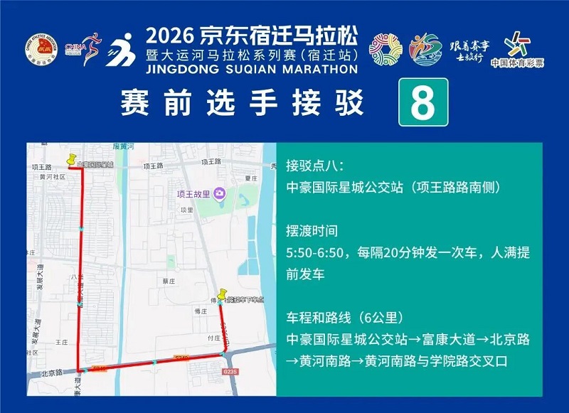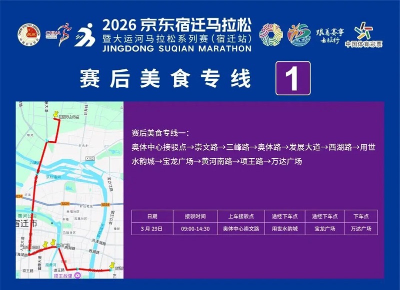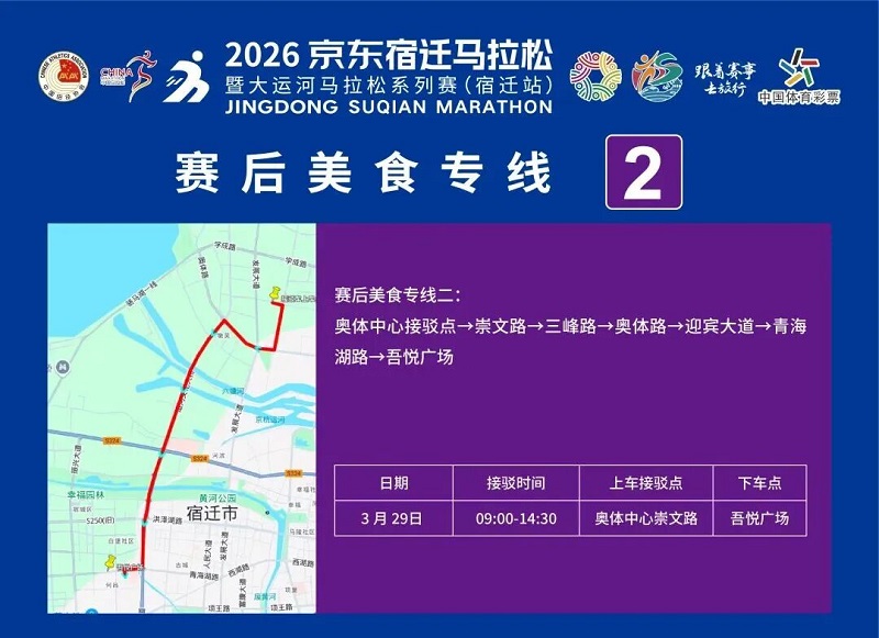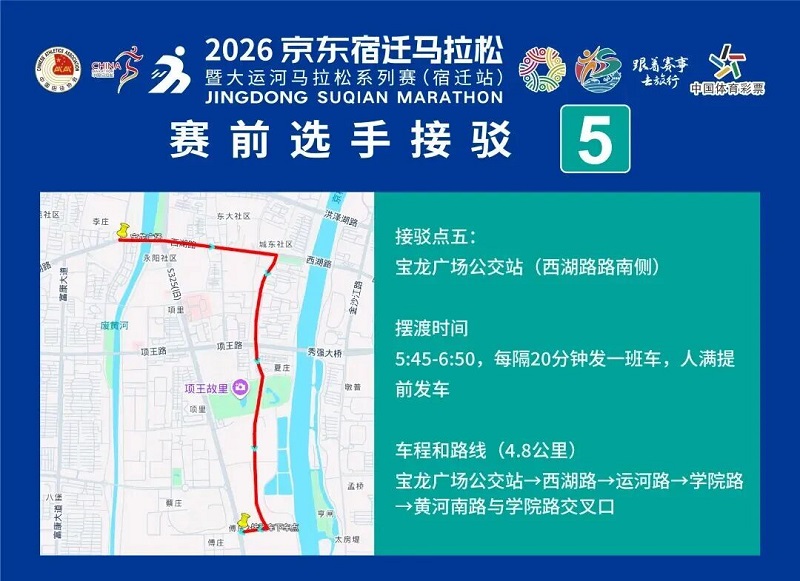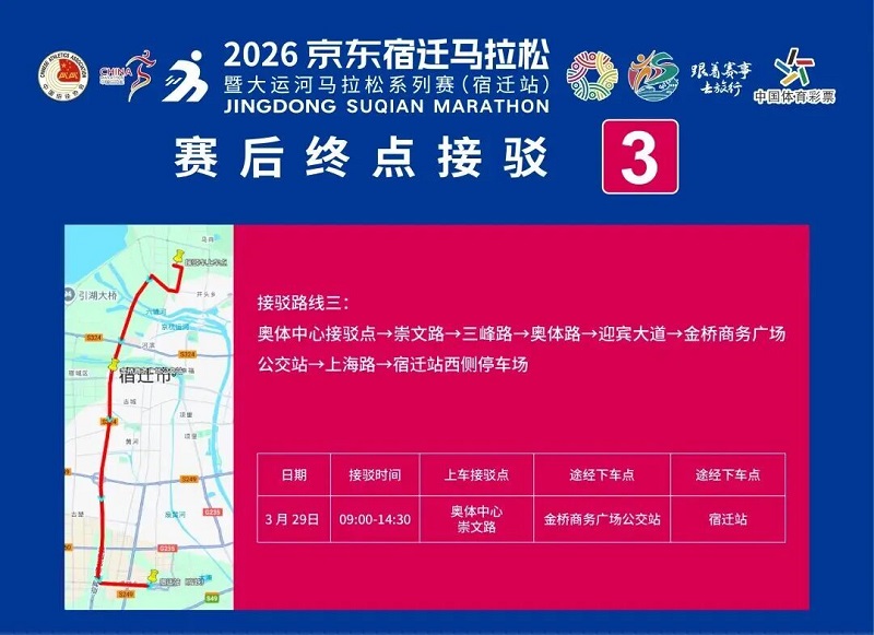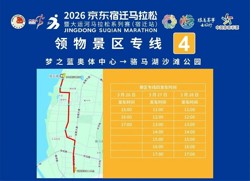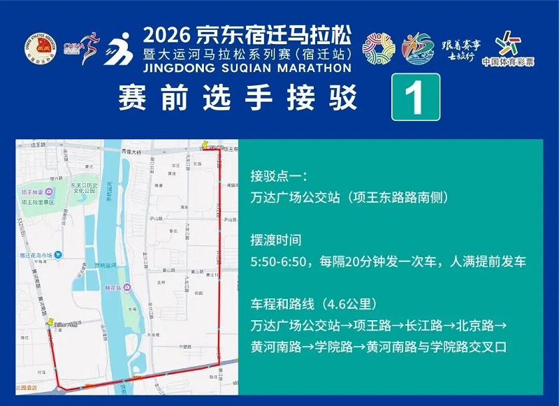 3月26日-30日,参赛选手可凭号码布或中签短信,免费乘坐宿迁市区内(宿城区、宿豫区、洋河新区、湖滨新区)公交车。