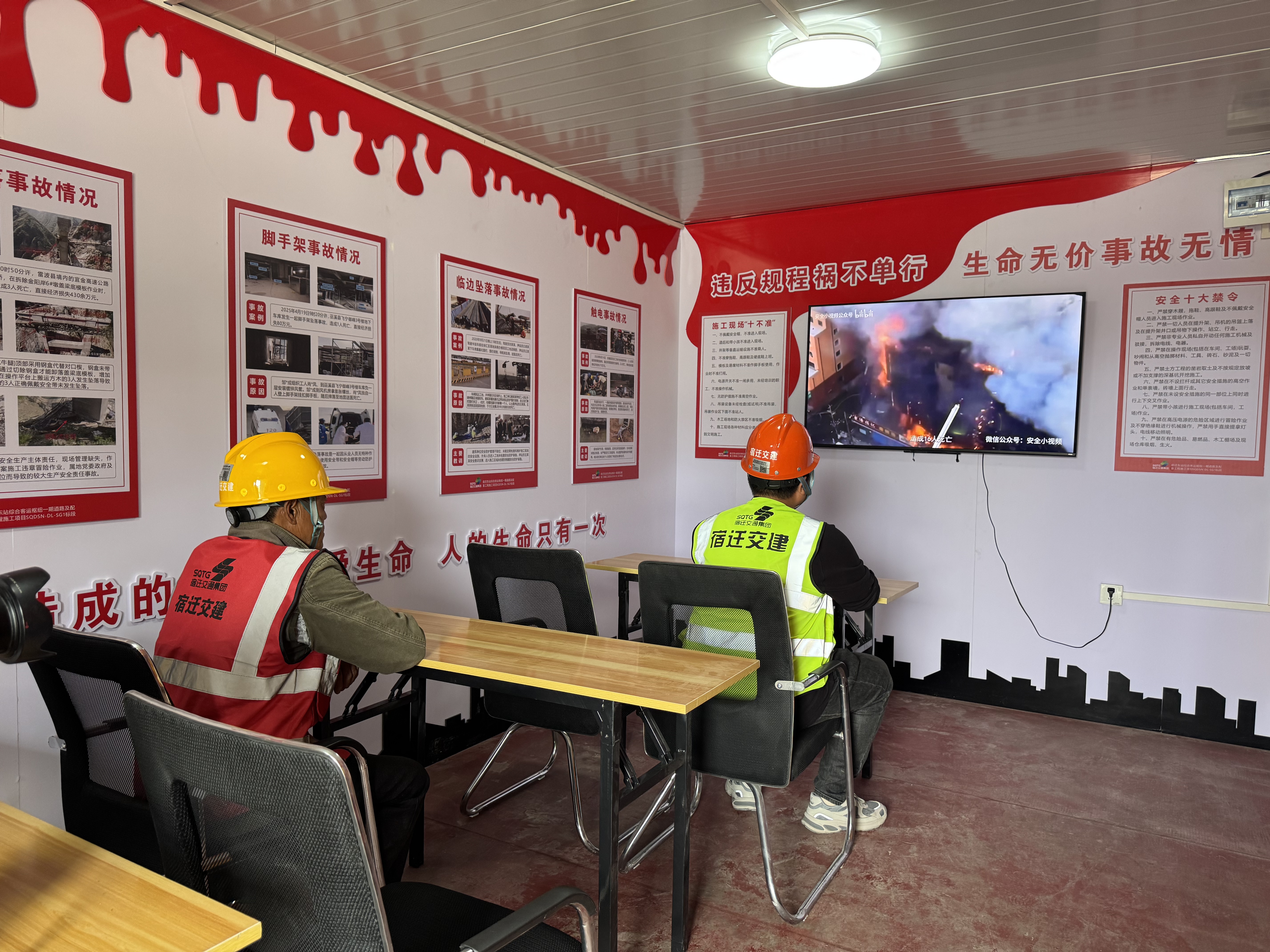 安全教育警示室里,几名工人正通过案例视频接受再教育