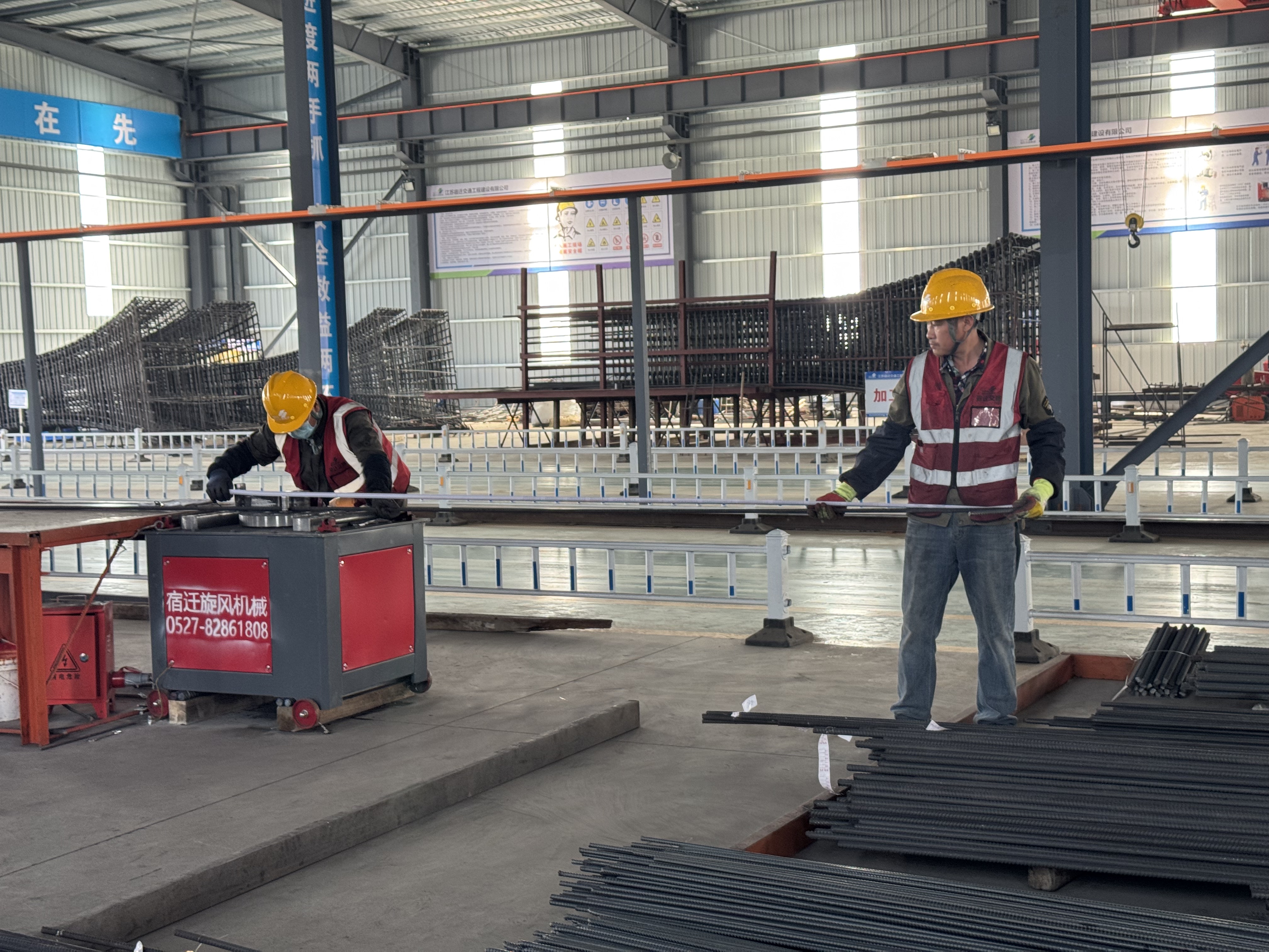 在施工现场钢筋集中加工配送中心,厂房内数控钢筋弯曲机、切断机等设备高效运转,工人们戴着安全帽、防护手套,在各自工位上有序作业。35岁的钢筋工王超正操作设备,将钢筋按设计尺寸精准弯折。“我主要负责钢筋半成品预制,每天早上6点到岗,根据生产任务单复核图纸、下料加工。现在项目全面推进,钢筋规格多、任务紧,我们班组分成白班、夜班两班倒,项目部也把后勤保障做得很到位,饮用水、药品、休息区一应俱全,让我们能安心干活。”他一边擦着额角的汗水,一边笑着说,“能参与宿迁最大的高铁枢纽建设,心里特别自豪,盼着高铁宿迁东站早日通车,以后出行更方便!”