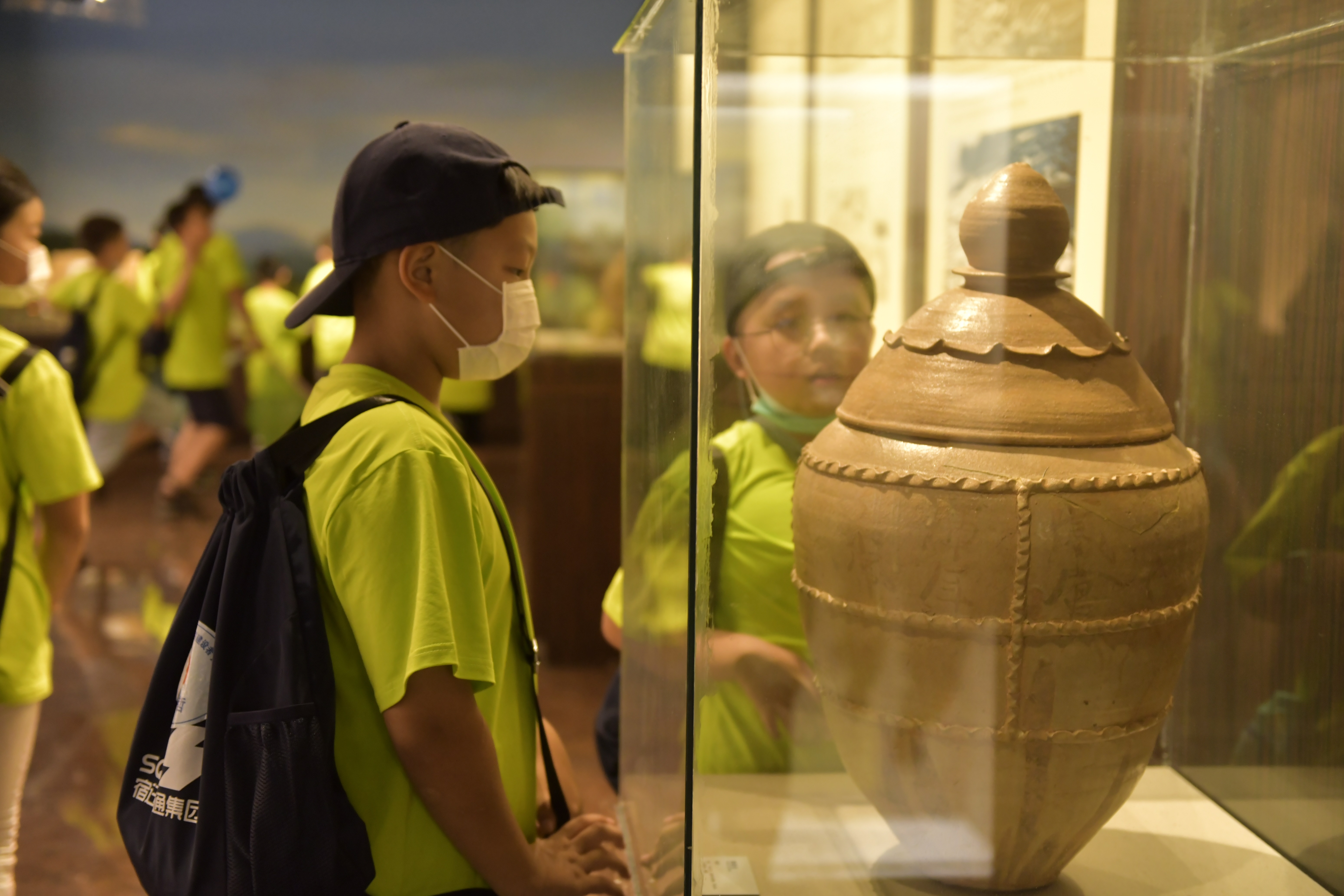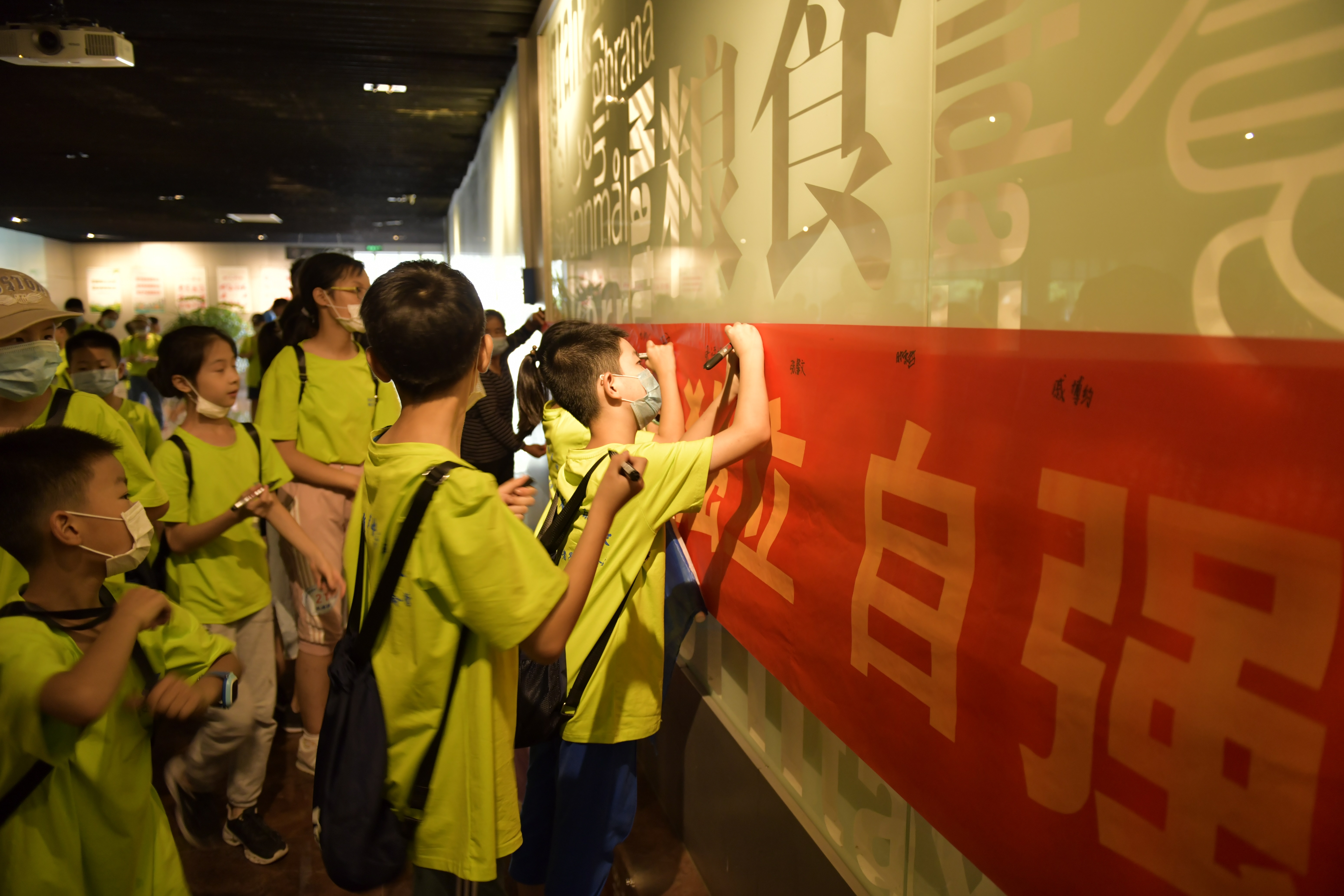 游戏结束后,孩子们前往中国粮食博物馆参观研学,并在“勤俭节约 独立自强”的横幅上签名承诺。