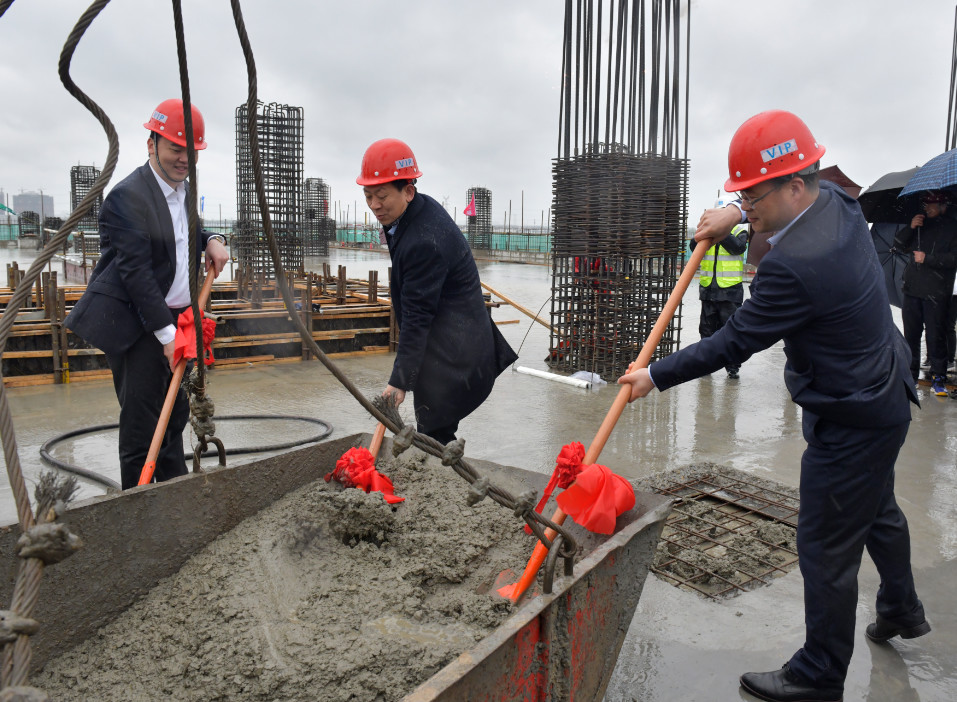 4月9日上午,在宿迁市综合客运枢纽换乘中心项目顶楼,随着最后一铲水泥搅拌着春雨缓缓落入方形槽中,宿迁市综合客运枢纽换乘中心正式封顶!