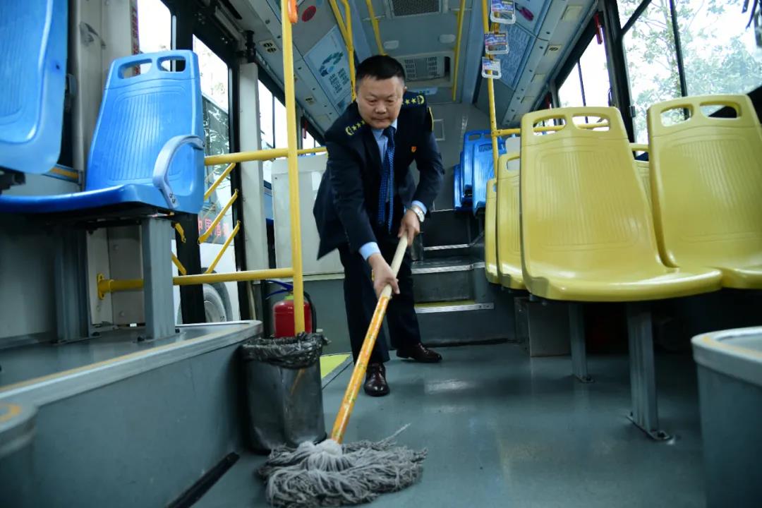 公交驾驶员利用发班间隙的休息时间打扫车辆