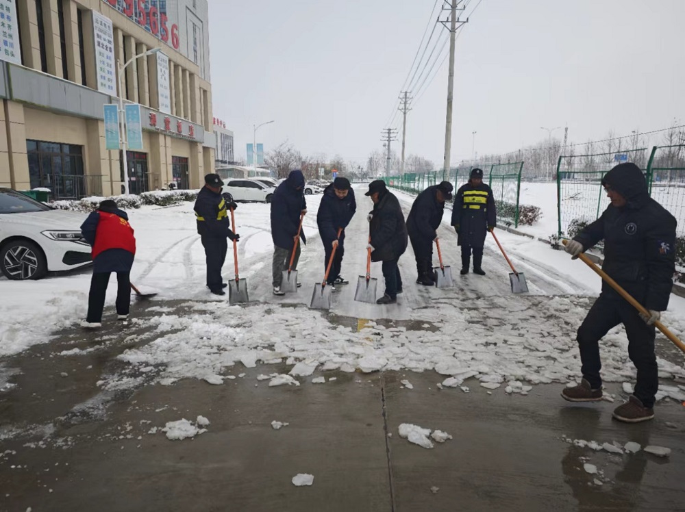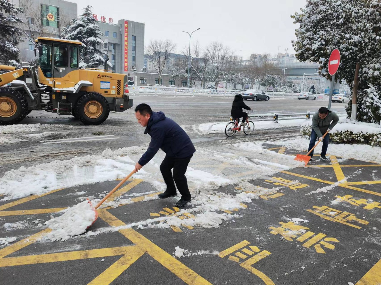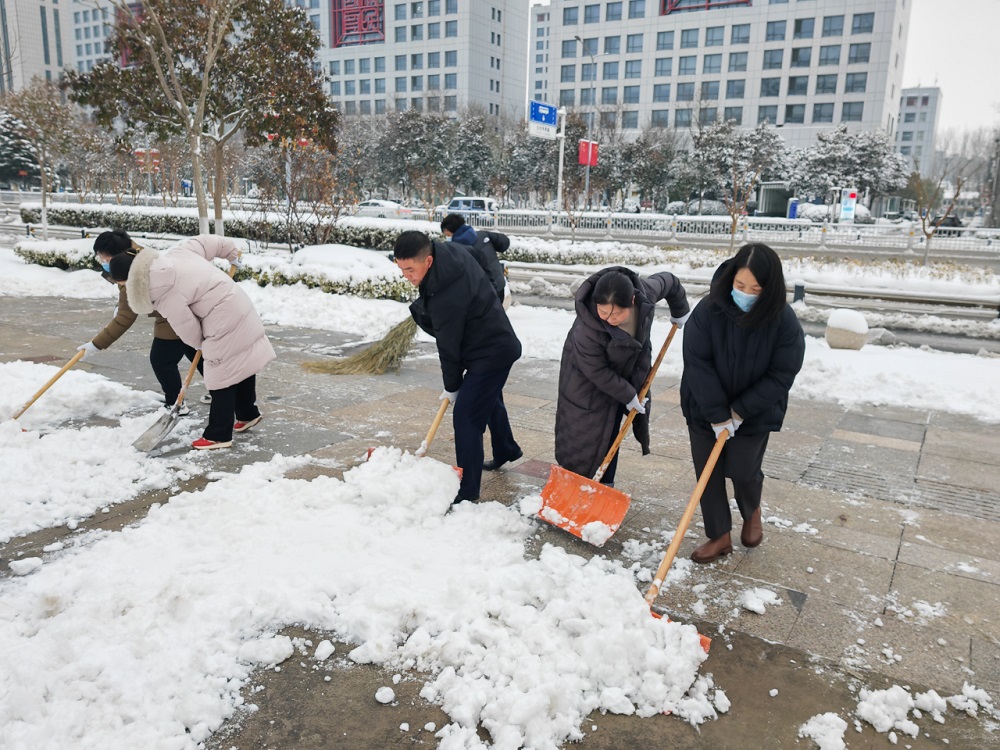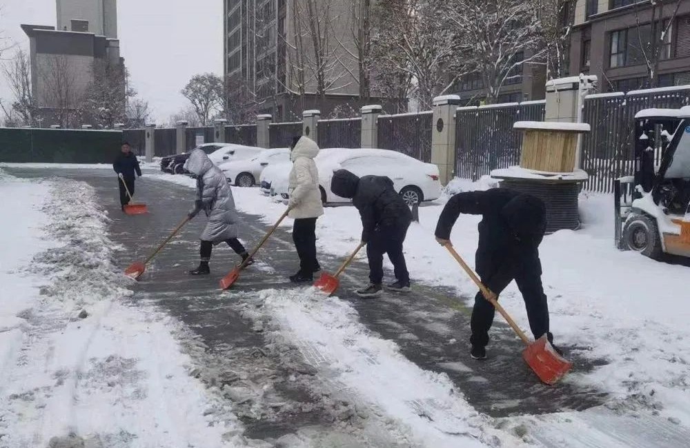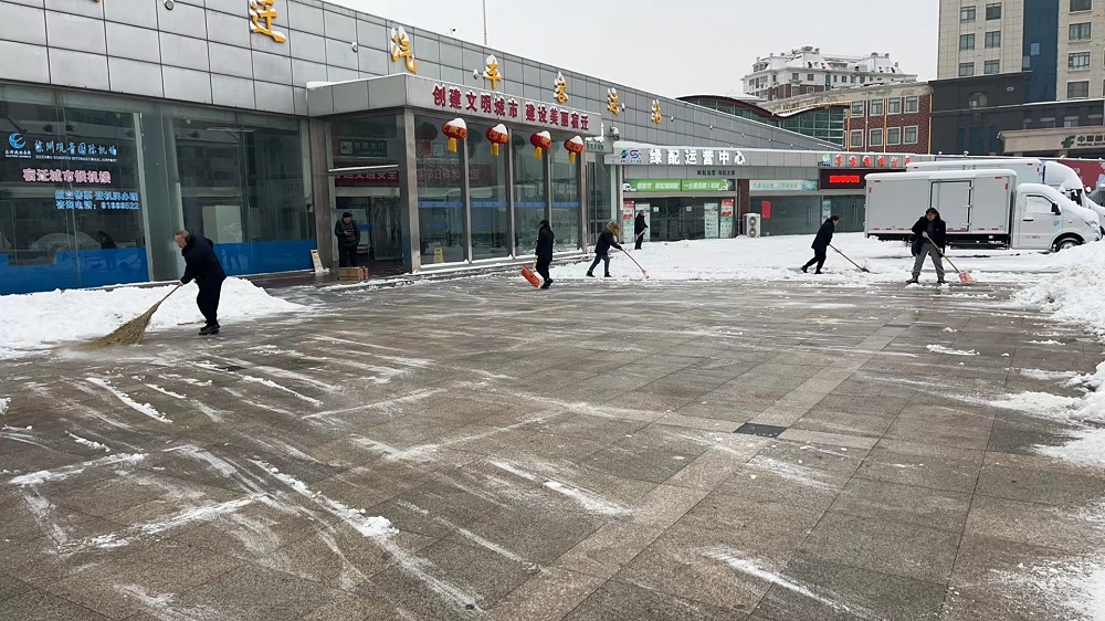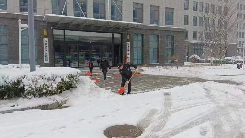 东枢纽公司组织全体干部职工高效有序开展扫雪除冰工作。对电子商务园区东枢纽公司办公大楼周边及主要通行路段进行清扫;对东枢纽建设者之家,紧急联动各租赁单位进行扫雪除冰工作,有效保障相关单位正常工作运转。