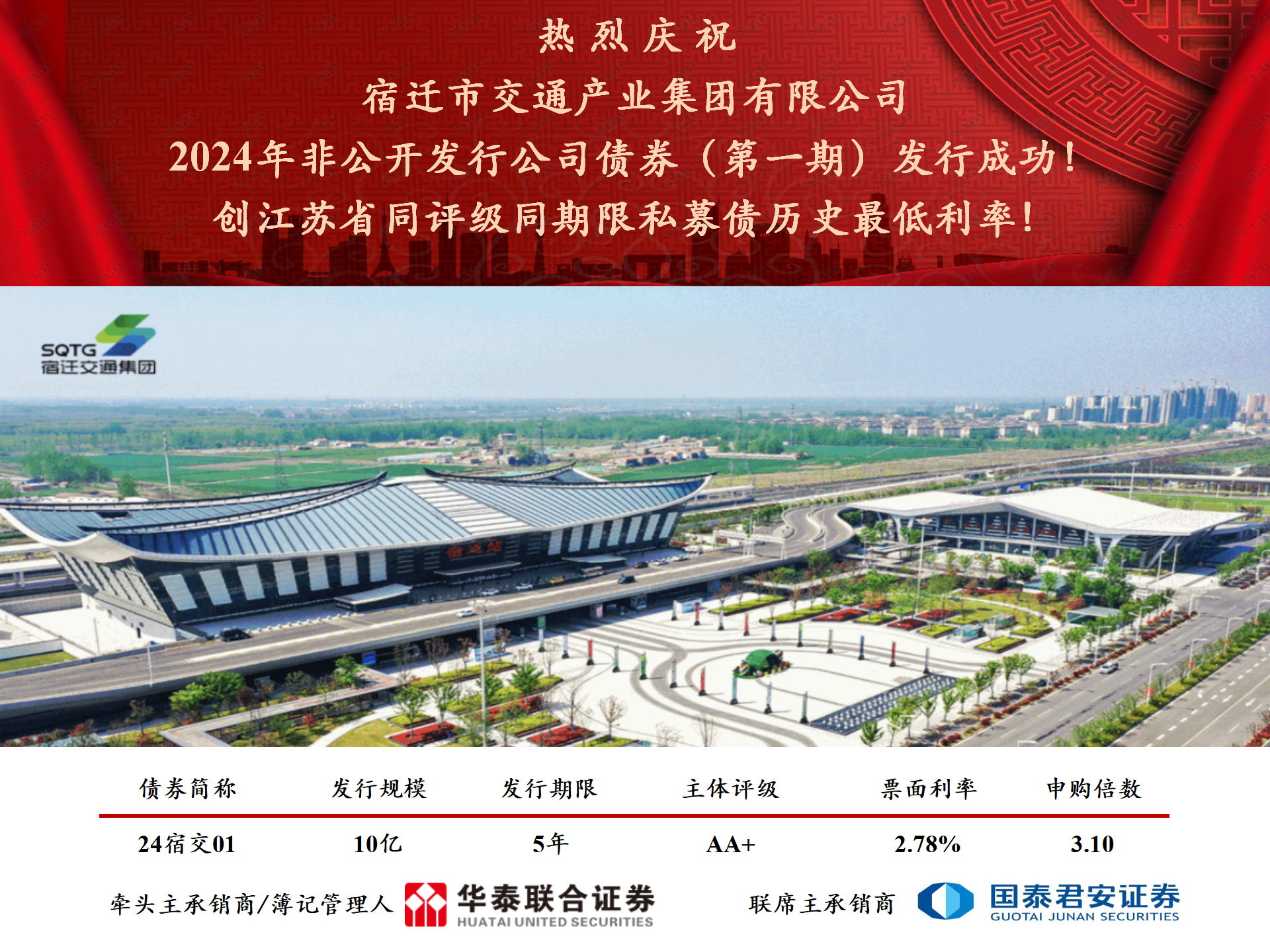 成功发行2024年非公开发行公司债券(第一期),发行规模10亿元,期限5年,由华泰联合证券、国泰君安证券联合承销,票面利率2.78%,创江苏省同评级同期限私募债历史最低利率。