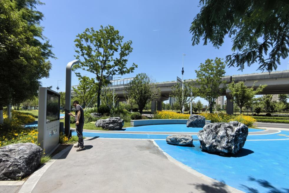 迎宾大道绿道全长8公里,通过串联小区、街角广场、绿地公园、桥下空间等地块,实现慢行系统与线性空间的有效整合。绿道在串联道路两侧原有绿地空间的基础上,合理增加了小游园、主题公园、活动广场、智慧健身等功能性场地,如新建各类休闲健身场地8处、乐享驿站6座、智慧健身步道1.5公里,新增休闲座椅、景观灯、健身器材、儿童游乐设施、垃圾桶、无障碍设施等配套便民设施,沿线增加微山花园、绣球花园、碉堡花园等多个游园节点,打造满足全龄活动的“乐享游园”。