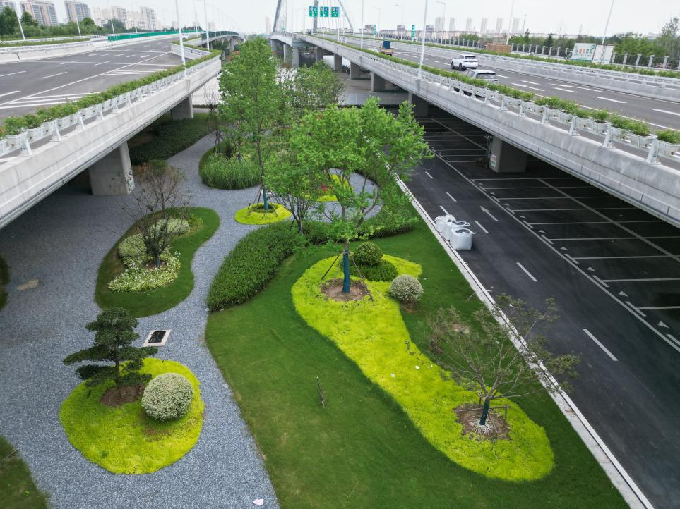 北京路绿道全长11.5公里,在北京路道路两侧宽约15~70米的绿地景观内建设生态绿道,将绿色空间融入居住、商业等场所,形成城林融合的生态大公园,为周边群众提供了休闲漫游、林荫漫步、新氧畅游的绿道体验。充分利用中运河两岸桥下灰色空间,设计桥下公园与海绵生态绿地,结合周边环境的功能需求与城市公交线路规划,在运河两岸的桥下空间形成集人文生态绿地、休闲健身活动场地、集中停车场、公交场站等多重功能综合利用的桥下公园场地,打造北京路中运河两岸的创新记忆点。
