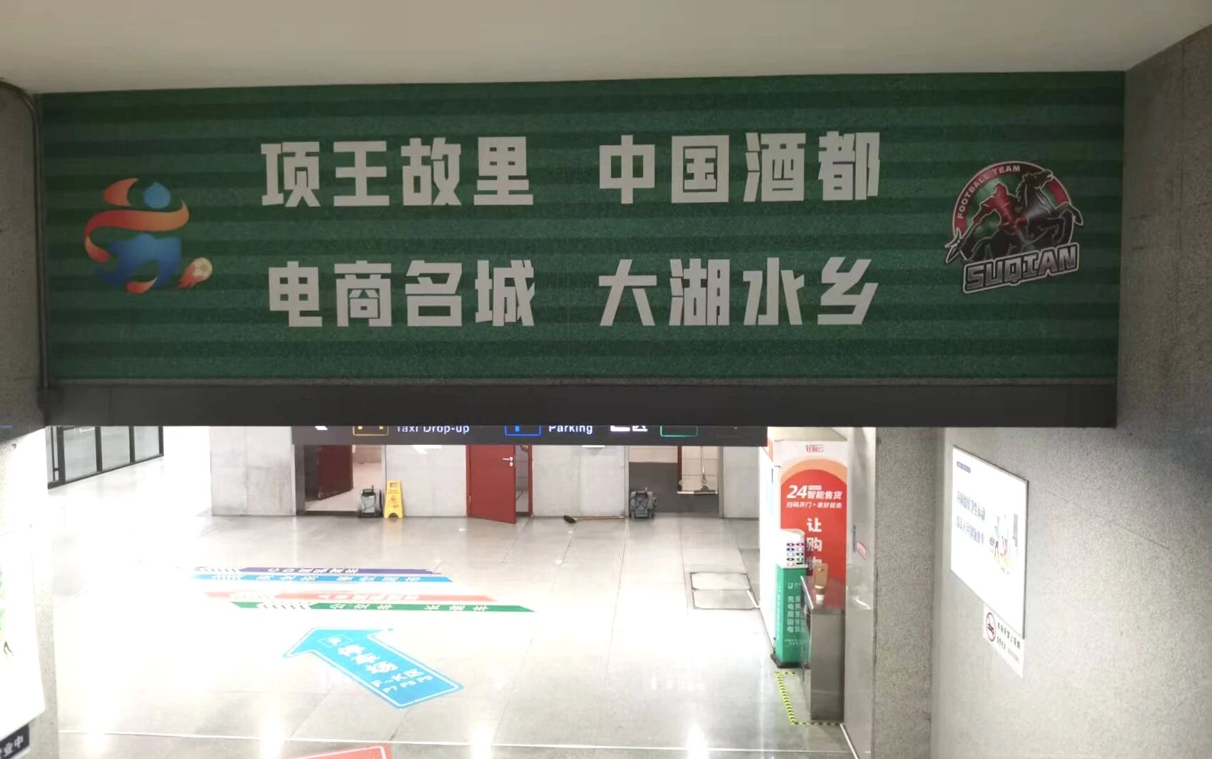 出站通道、风雨连廊等处,“酒都豪情 绿茵称雄”“霸王出征 势不可挡”“喝宿迁美酒 交天下朋友”等标语格外醒目。结合项羽虞姬IP主题海报与“情义宿迁 深爱之城”城市形象,足球赛事、西楚文化与城市魅力相融共生,向八方来客展现着宿迁的豪迈与热情。