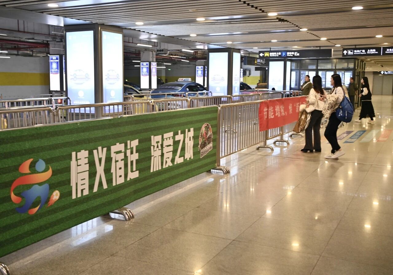 在高铁宿迁站精心打造赛事主题氛围布置,让抵宿旅客出站即被满满激情包围,感受城市活力与温情。