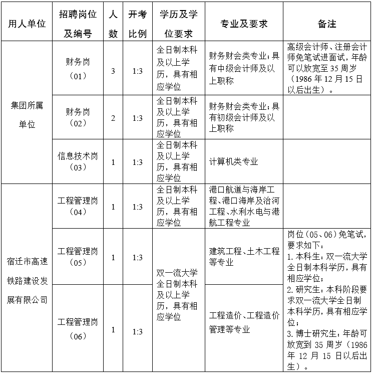 5. 具备招聘岗位要求的其它资格和条件。具体详见《宿迁市交通产业集团有限公司2022年招聘岗位表》。
