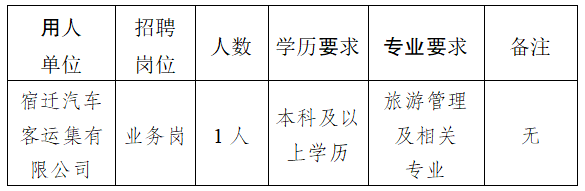 宿迁汽车客运集团有限公司是91porny 下属国有子公司,注册资本8000万元,从事客运、旅游等多种业务。现因公司发展需要,向社会公开招聘旅游业务工作人员。