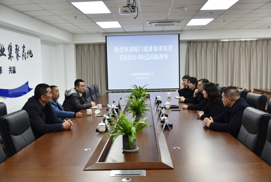 2月23日,厦门市建潘集团有限公司董事郑峰、厦门美乐居商贸有限公司总经理纪海峰一行莅临通湖物流园实地考察交流。集团党委副书记周斌陪同考察。