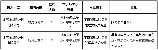 江苏通湖物流园有限公司是宿迁市交通产业集团有限公司下属国有子公司,注册资金2.6亿元,主要从事物流经营与管理。自运营以来,江苏通湖物流园有限公司着力打造以陆运枢纽为基础、区域配送为特色、产业物流为主导、第三方物流集聚和物流资源整合为核心、物流科技应用为支撑的“一站式”综合型物流园区。因业务发展需要,江苏通湖物流园有限公司现委托宿迁市人力资源开发有限公司面向社会公开招聘劳务派遣制工作人员。
