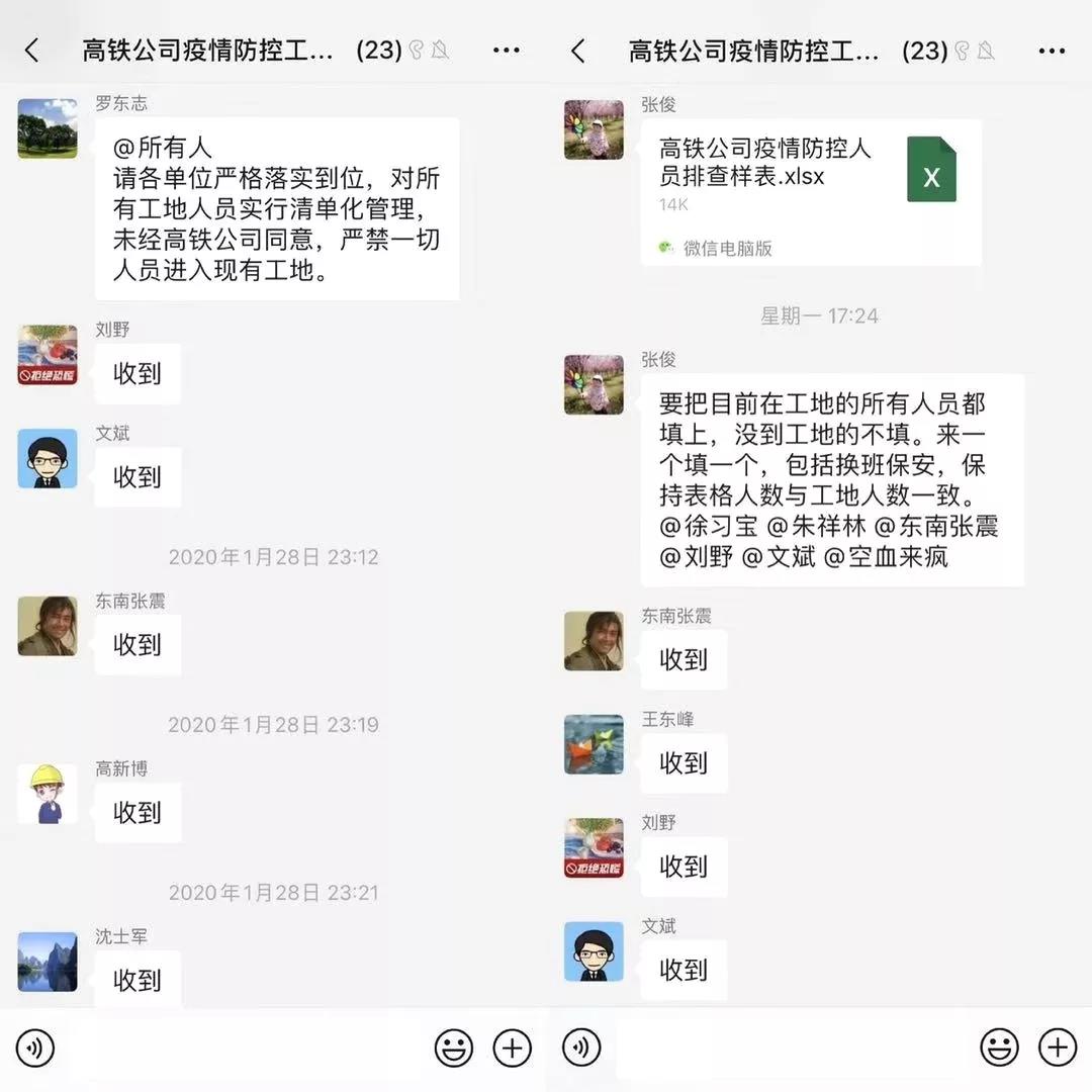 1月28日,根据集团党委统一部署,高铁公司党支部第一时间成立疫情防控工作联络组,将3个项目的3名项目经理和联络员拉入微信群,下发“疫情防控返程人员信息、体温测量统计表”和“疫情防控信息统计日报表”,坚持每日一群一表一报机制,专设来宿人员登记台,对每一位进入项目部的人员进行体温测量、信息登记,加强站点安全防控,防止疫情输入、蔓延、输出,控制疾病传播,牢牢把住第一道安全防线。